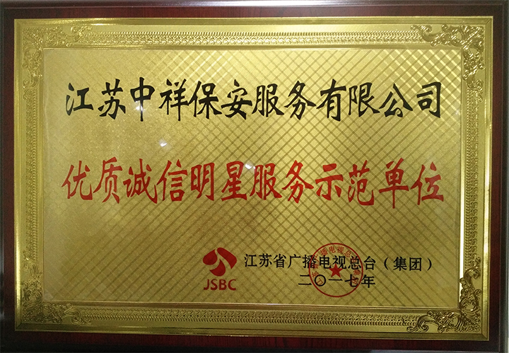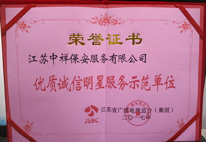 中祥保安公司榮獲江蘇省廣播電視總臺2017年優(yōu)質誠信明星服務示范單位